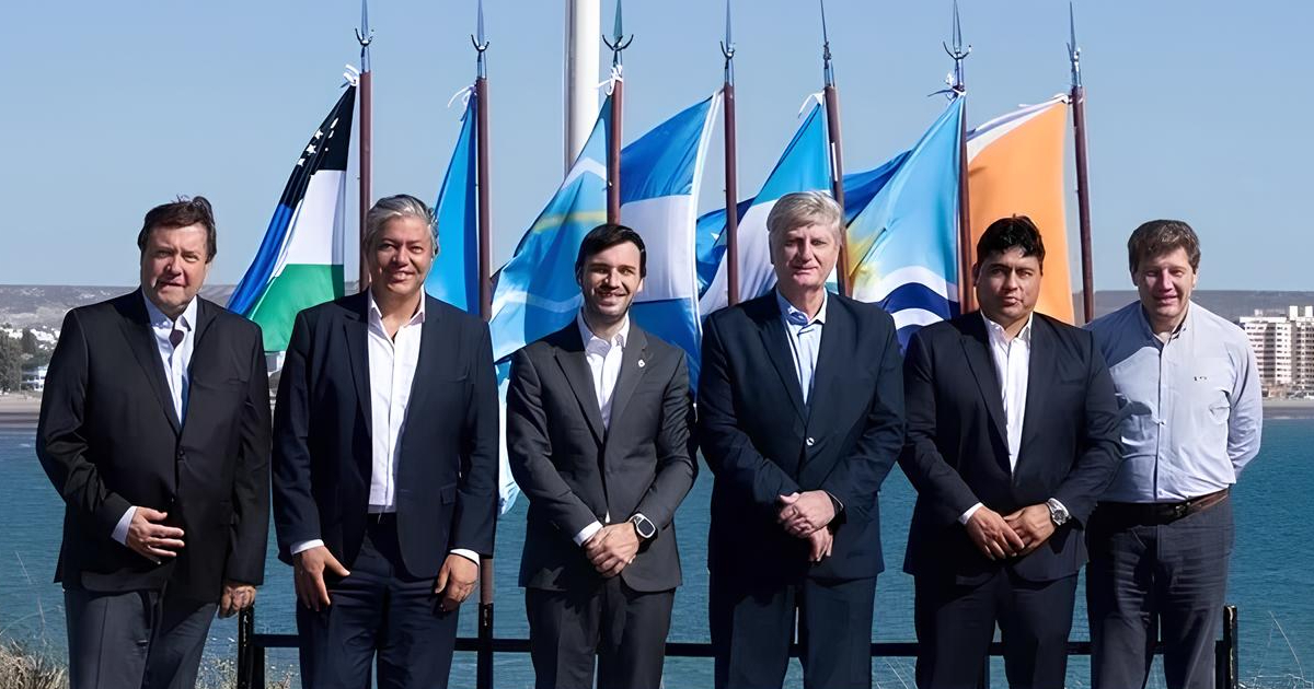 En la ilustración de esta nota, los seis gobernadores patagónicos, en un encuentro en Puerto Madryn en marzo de 2024: Alberto Weretilneck, Río Negro; Rolando Figueroa, Neuquén; Ignacio Torres, Chubut; Sergio Ziliotto, La Pampa; Claudio Vidal, Santa Cruz; Gustavo Melella, Tierra del Fuego.